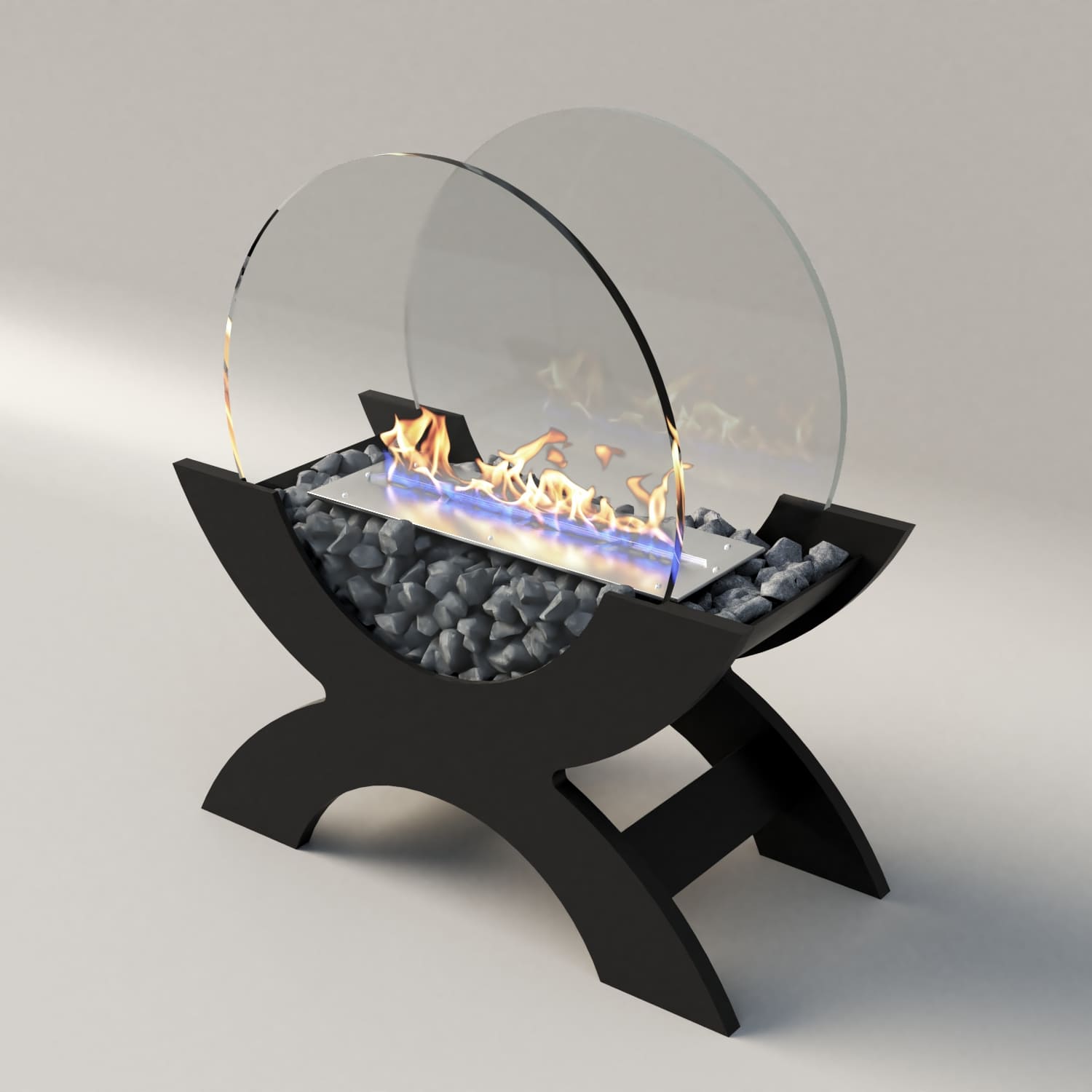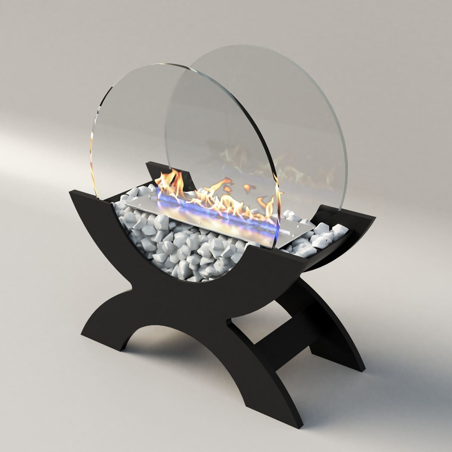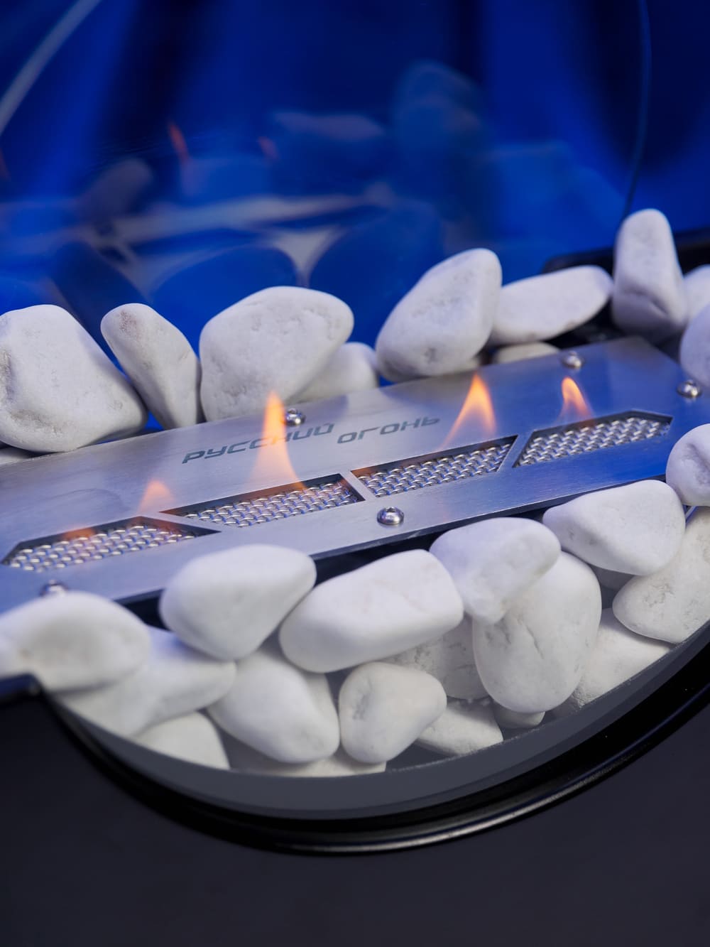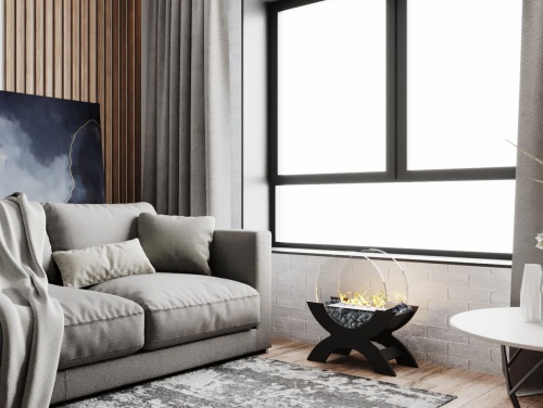 Переносной камин устанавливается на полу и не требует дымохода. Линия огня данного камина 300 мм, располагается практически по всей длине камеры сгорания. Основание биокамина — 100% сталь, ножки изготовлены из МДФ, топливный блок выполнен из высококачественной нержавеющей стали, наполнитель — керамическое волокно, а также закаленные жаропрочные стекла толщиной 6 мм, камни — галтованный мрамор.