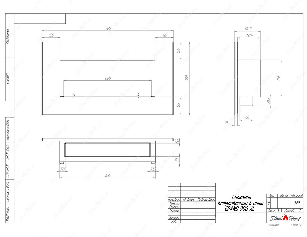 Встраиваемый Биокамин SteelHeat GRAND-H 900 XL предназначен для встраивания в глухие ниши из гипсокартона, кирпича, пеноблоков, бетона.