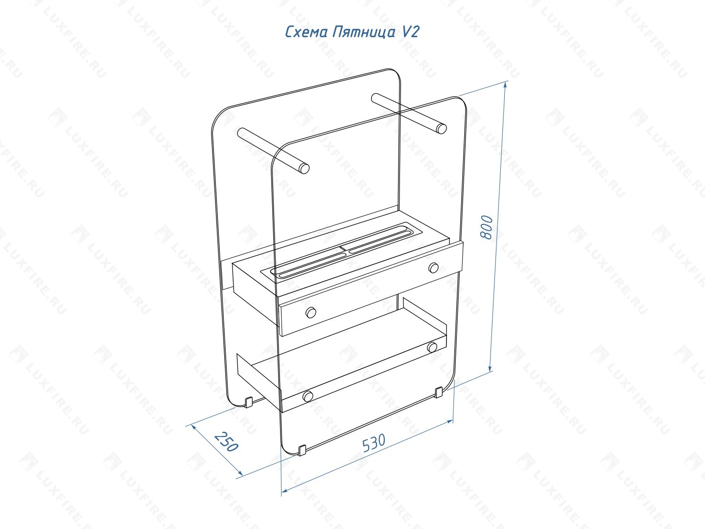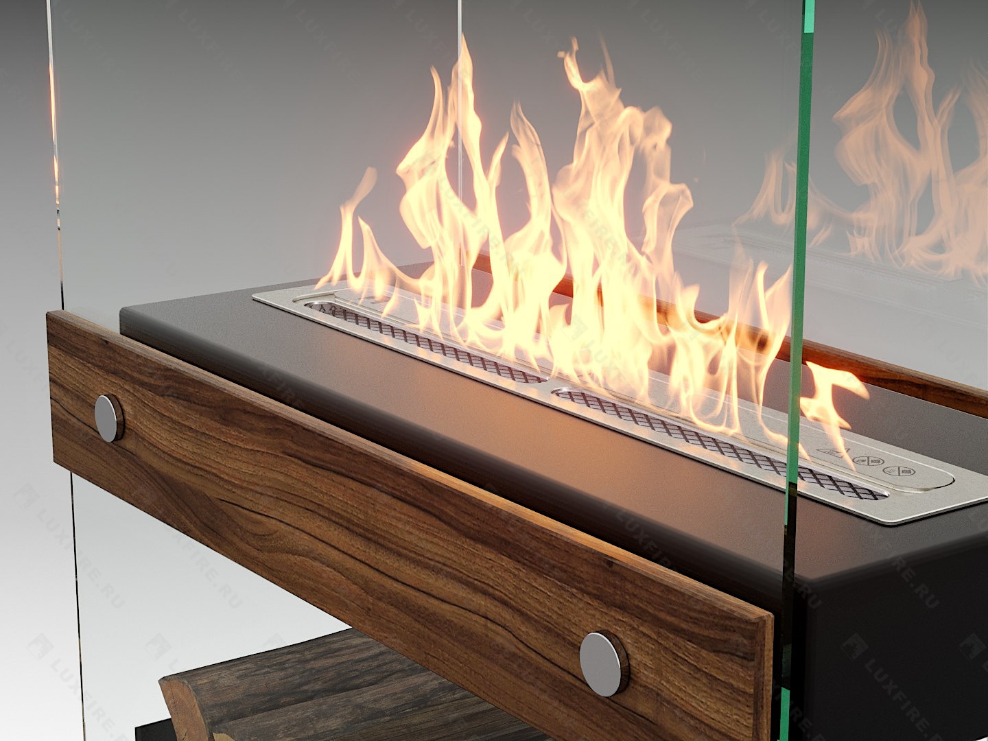 Представляет собой сборную модель оригинального авторского дизайна студии "Vontaren&Grinero" из закаленного прозрачного стекла и топливного блока Luxfire 450 XS на подиуме, закрепленного на 12 дистанционных держателях. С деревянными натуральными накладками и набором дров с дровницей, обработанных огнебиозащитным средством.