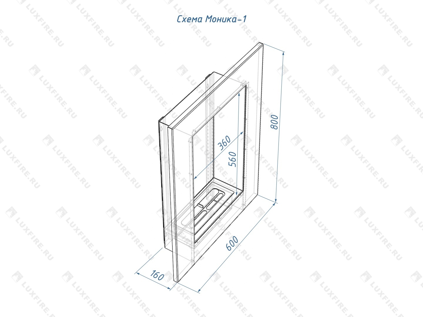 Представляет собой цельную металлическую конструкцию белого цвета класса XS, создающую полузакрытое безопасное пространство для огня с топливным блоком Lux Fire увеличенной емкости 300 SN в котором горит живой огонь 6 (!!!) часов с углом обзора 180 градусов. Универсально подходит для встройки в нишу или подвеса на стену.
