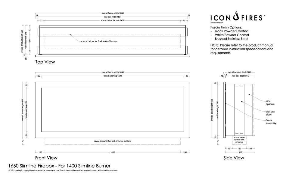 Встраиваемый биокамин Slimline Firebox 1650FB с декоративной рамкой выполненной из нержавеющей стали с брашированной поверхностью, комплектуется горелкой ICON FIRES Slimline 1400mm.Камин изготовлен из стали с декоративным покрытием термостойкой краской.