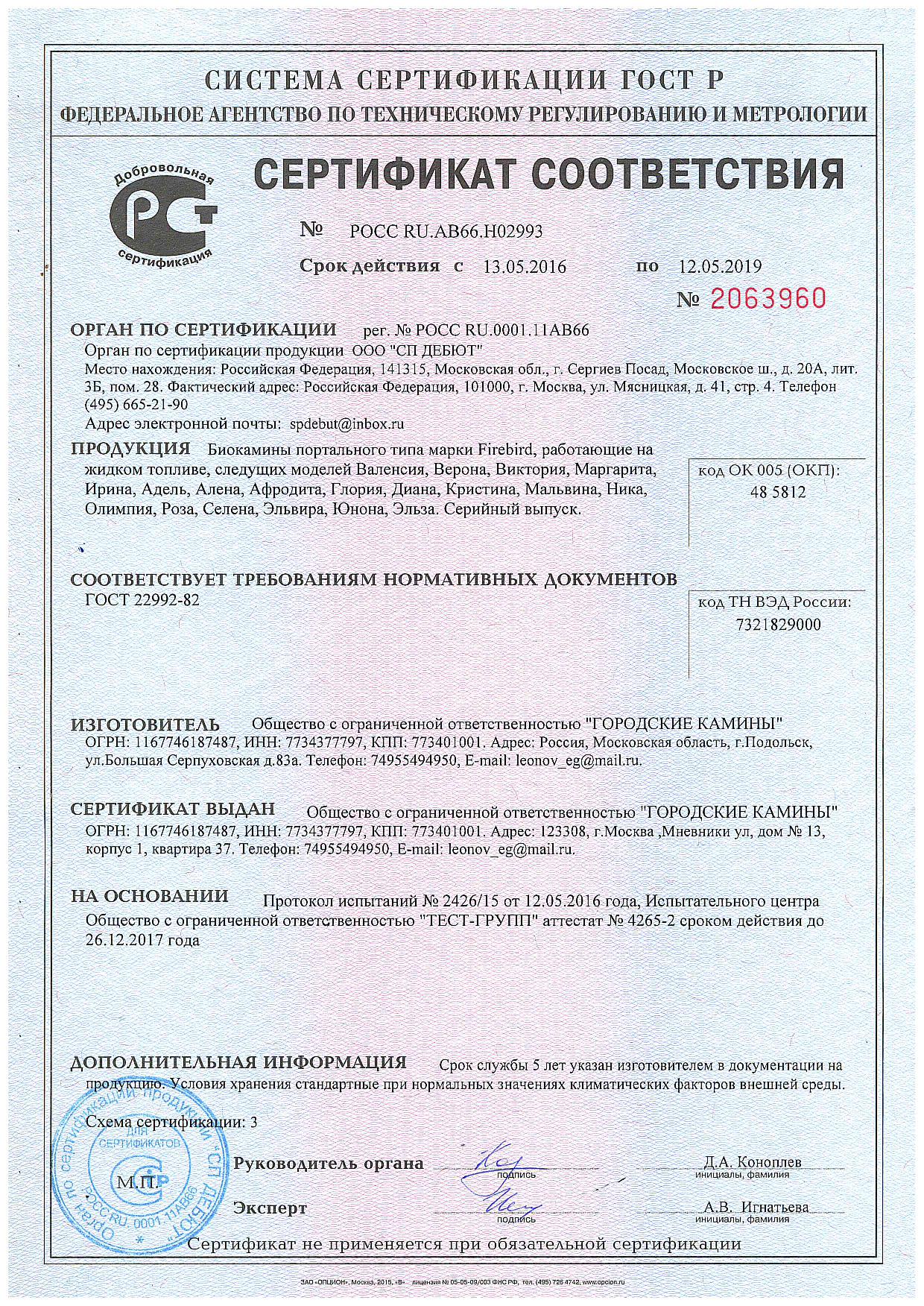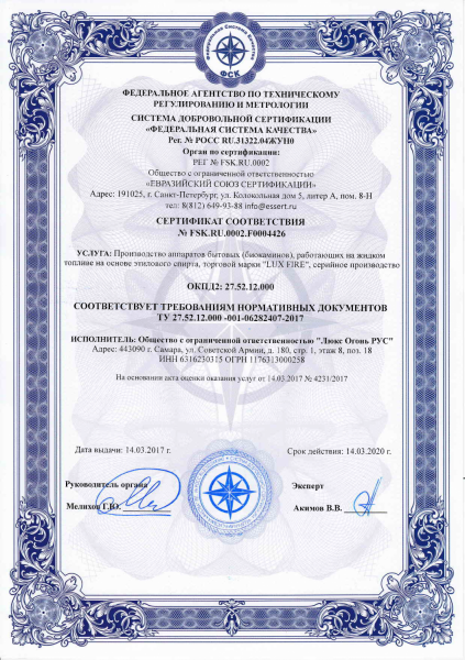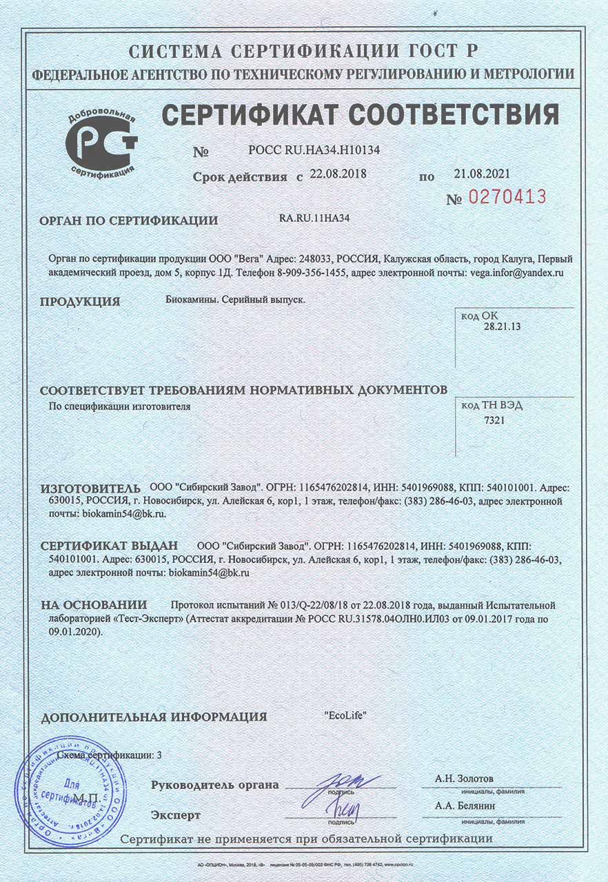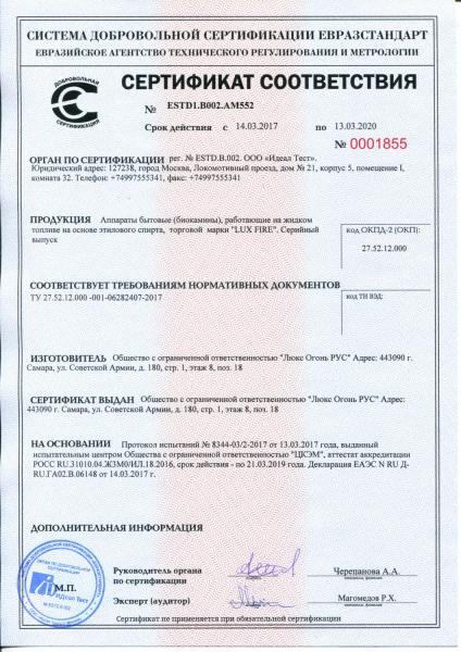 Сертификат соответствия подтверждает, что Топливные блоки, Биокамины встраиваемые, Биокамины настенные, Биокамины напольные, Биокамины настольные, изготовленная в соответствии со спецификацией изготовителя. Перечень продукции - Приложение на бланке №00348. Серийный выпуск.